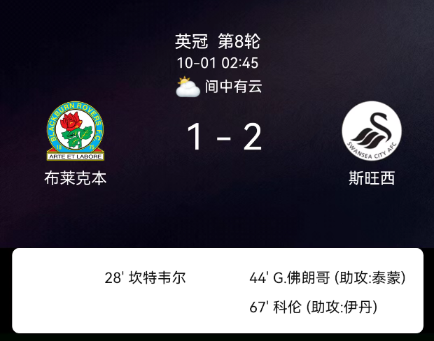 北京时间10月1日,英格兰足球冠军联赛第8轮,布莱克本流浪者主场对阵斯旺西。主队先破门却遭客队连扳两球逆转,双方均有球员染黄,最终比分,布莱克本流浪者1-2斯旺西。