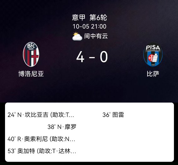 北京时间10月5日,意大利足球顶级联赛第6轮,博洛尼亚主场迎战比萨。第24分钟达林加助攻坎比亚吉破门为博洛尼亚首开纪录,第36分钟比萨伊德里萨-图雷染红离场;第38分钟莫罗破门扩大比分,第40分钟坎比亚吉助攻奥尔索利尼再入一球,下半场第53分钟达林加助攻延斯-厄德高锁定胜局,最终比分,博洛尼亚4-0比萨。