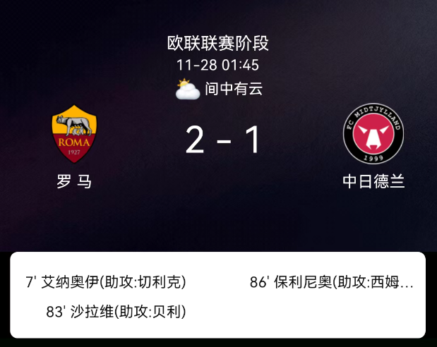 北京时间11月28日,欧足联欧洲联赛联赛阶段第5轮,罗马主场对阵中日德兰。第7分钟艾纳维破门,1-0;第84分钟沙拉维破门,2-0;第88分钟保罗-维克托破门,2-1;双方均无红黄牌。最终比分,罗马2-1中日德兰。