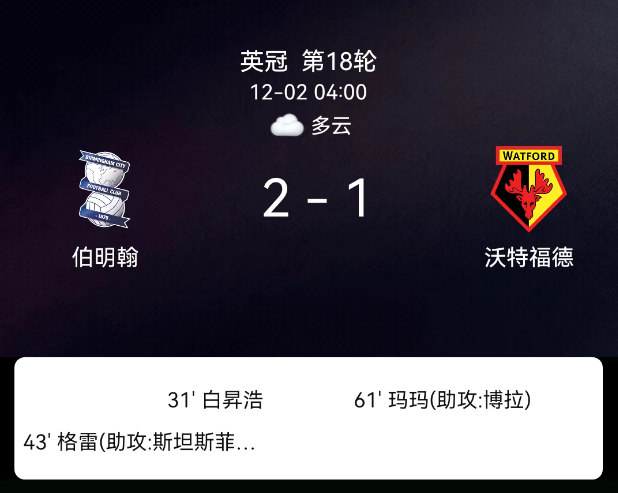 北京时间12月2日,英格兰足球冠军联赛第18轮,伯明翰主场对阵沃特福德。第20分钟沃特福德染黄;第24分钟伯明翰染黄;第31分钟白昇浩破门,1-0;第43分钟格雷破门,2-0;第61分钟奥斯曼-马马破门,2-1;第77分钟至80分钟双方各添2黄1黄;伯明翰3黄、沃特福德3黄;无红牌。最终比分,伯明翰2-1沃特福德。