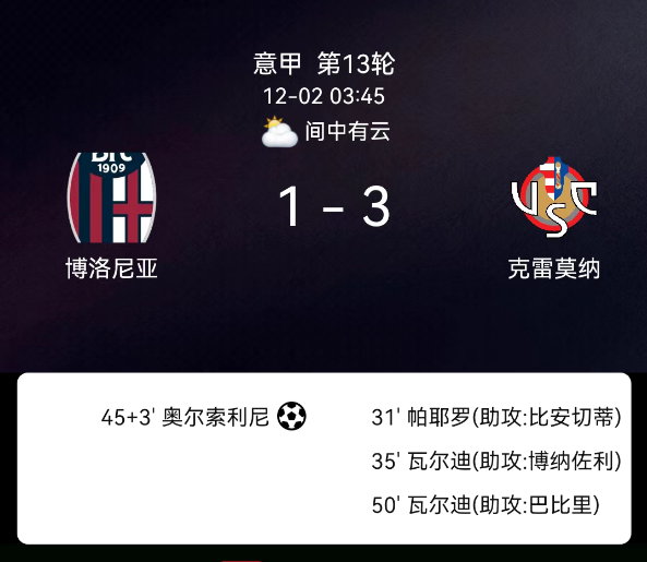 北京时间12月2日,意大利足球甲级联赛第13轮,博洛尼亚主场对阵克雷莫内塞。第31分钟帕耶罗破门,0-1;第35分钟瓦尔迪破门,0-2;第45+3分钟奥尔索利尼点射,1-2;第50分钟瓦尔迪再破门,1-3;克雷莫内塞2黄、博洛尼亚无牌。最终比分,博洛尼亚1-3克雷莫内塞。