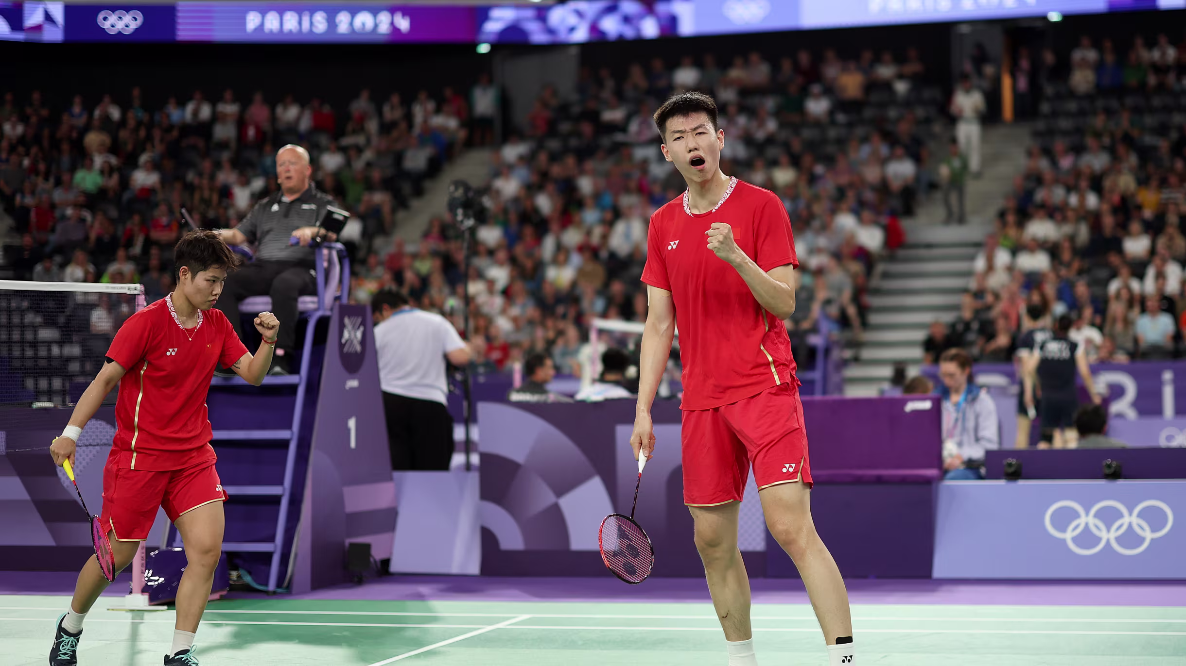 两对中国组合本场比赛前有过16次交手,“凤凰”组合13胜3负占据绝对优势。不过本次赛事开赛以来,两对组合都保持着非常好的状态。首局开始后,双方进入状态都很快,比分交替上升。“凤凰”组合犀利的进攻帮助他们以11比9的领先优势进入技术间歇,回到赛场之后,冯彦哲/黄东萍越打越兴奋,一波7比0的得分高潮将分差拉开到18比9。首局比赛至此失去悬念,21比13,“凤凰”组合先下一城。