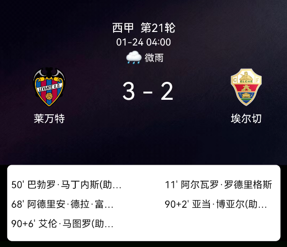 北京时间1月24日,西班牙足球甲级联赛第21轮,莱万特主场对阵埃尔切。第11分钟罗德里格斯破门0-1;第50分钟马丁内斯破门1-1;第68分钟德拉富恩特破门2-1;补时2分钟博阿亚尔破门2-2;补时6分钟马图罗破门3-2;双方无红黄牌。最终比分,莱万特3-2埃尔切。