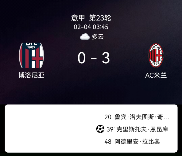 北京时间2月4日,意大利足球顶级联赛第23轮,博洛尼亚主场对阵AC米兰。第20分钟奇克破门0-1;第38分钟恩昆库点射0-2;第48分钟拉比奥破门0-3;双方无红黄牌。最终比分,博洛尼亚0-3AC米兰。