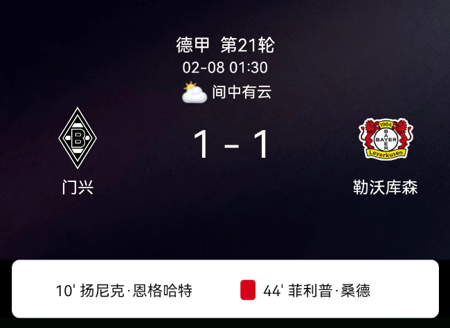 北京时间2月8日德甲第21轮,门兴格拉德巴赫对阵勒沃库森。第8分钟恩格尔哈特破门1-0;第28分钟迪克斯黄牌;第45分钟桑德尔乌龙1-1;无其他红黄牌及进球。最终比分,门兴格拉德巴赫1-1勒沃库森。