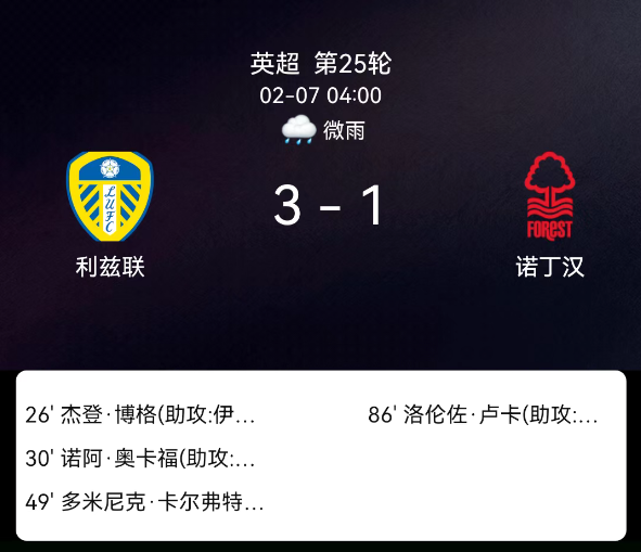 北京时间2月7日英超第25轮,利兹联对阵诺丁汉森林。第26分钟博格尔破门1-0;第30分钟奥卡福尔破门2-0;第49分钟勒温破门3-0;第86分钟卢卡破门3-1;双方无红黄牌。最终比分,利兹联3-1诺丁汉森林。