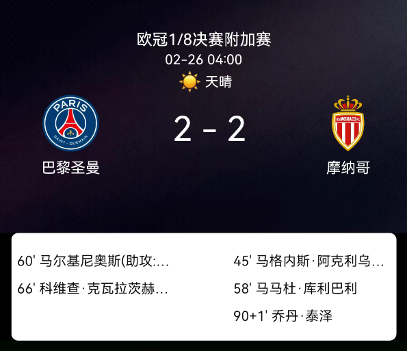 北京时间2月26日欧冠附加赛次回合,巴黎对阵摩纳哥。第45分钟阿克利乌什破门1-0;第58分钟库利巴利两黄变一红被罚下;第60分钟马尔基尼奥斯破门1-1;第66分钟克瓦拉茨赫利亚破门2-1;第90+1分钟特泽破门2-2。最终比分,巴黎2-2摩纳哥,总比分5-4晋级。