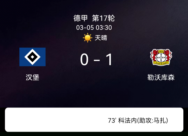 第73分钟:科法内禁区内爆射破门,勒沃库森1-0汉堡。