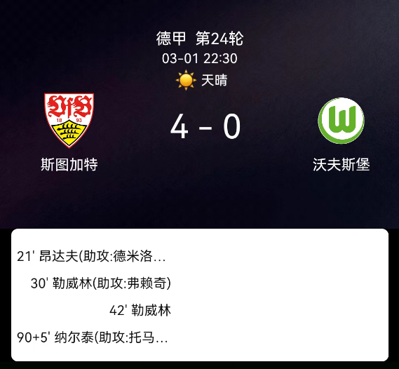 北京时间3月1日德甲第24轮,斯图加特对阵沃尔夫斯堡。第21分钟昂达夫破门1-0;第30分钟莱韦林破门2-0;第42分钟莱韦林再入3-0;补时阶段纳尔泰破门4-0;双方无红黄牌。最终比分,斯图加特4-0沃尔夫斯堡。